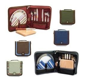 - Travel pack with deluxe wine and cheese service for two; including plates and full-tang flatware; it is made of polyester canvas.
